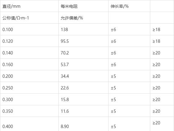 软态合金丝的每米电阻值及伸长率示于下表,同轴合金丝的每米电阻值变化≤3%;